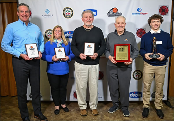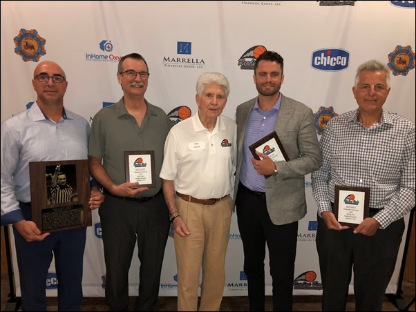 Awards were given at the Reading Berks Basketball Association (RBBA) Summer Shindig held on September 18th at the Victor Emmanuel II Beneficial Society to: (L-R) Kevin Line – George Zeppos Memorial Officiating Award, Mike Bucher – RBBA Distinguished Service Award, Mike Schorn – RBBA Awards Chairman, Alex Yoh – RBBA Distinguished Service Award and Mike Drago – RBBA Distinguished Service Award.