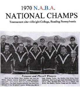 Background: The Exeter Black Knights are known by many as “Berks County’s Dream Team”. The team competed in the National Amateur Basketball Association (NABA) for three years, 1968-69, 1969-70, and 1970-71. Bill Giles was the owner and general manager. Rod Hand was the head coach and primary recruiter. The Black Knights competing in the NABA won their league in the 68-69 season but lost in the first round of the national tournament in Springfield. In 1970 they again won their league and hosted the NABA national championship tournament at Albright College. They won four straight games and played the national championship game in front of a standing-room-only crowd. The 1969-70 roster included many of Berks County’s legendary players: Jim Aikens, Dick Braucher, B.J. Ellison, Dick Graul, Don Hadley, Jim Krick, Ron Krick, Bruce Sadowskas, John Scholl, Jim Stocker, Clayton Taylor, and Charlie Young. Rod Hand went on to a successful high school coaching career at Exeter H.S. and then was head coach at Alvernia College for 9 years from 1981 – 1990 and was 124-142. In 2002, the Black Knights were honored by the Berks County Chapter of the PA Sports Hall of Fame as a “Legendary Team of the Past”.