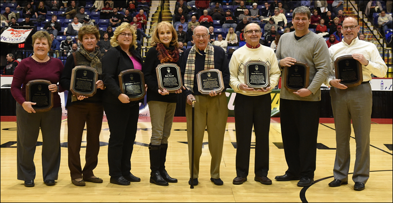The 2017 inductees into the Berks County Basketball Hall of Fame on February 15 at the Santander Arena are, from left, Reggie Weiss; Kim Hiester, accepting for her brother Jay Bruchak; Mike Reedy; Jim Snook; Don Bertram; Adelle Schade; Patty Dugan Behen, accepting for her late sister Peggy Dugan; and Chiara Sockel Renninger.