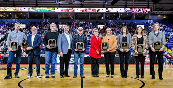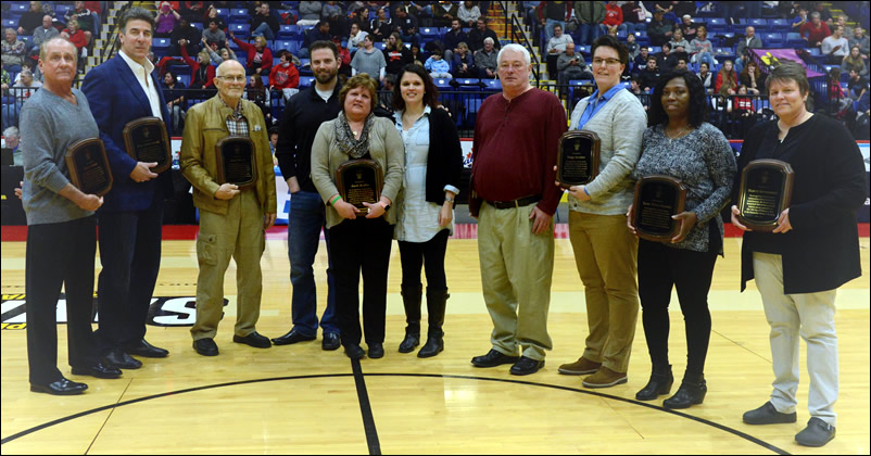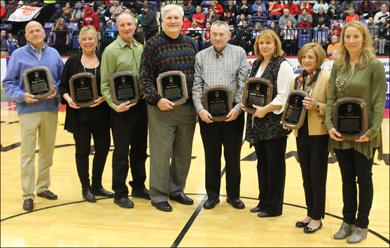 2015 Hall of Fame Inductees: (L-R) Cheryl Babula; Missy Sallade; John Scholl, accepting for Wilbur Renken; Brian D’Amico; Brian Menet; Mike Klahr; Ron Druckenmiller; and Kathy Kreider, accepting for Jesse Rowe.