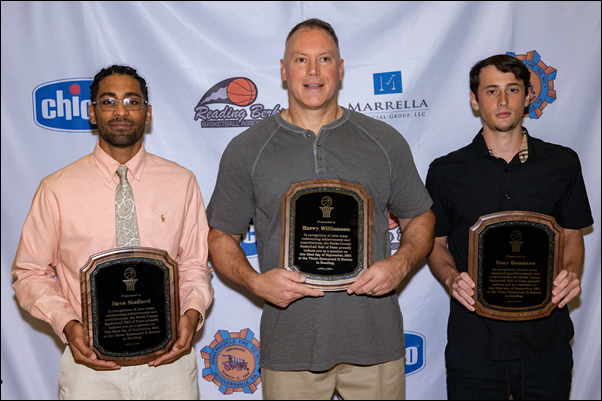At the RBBA Summer Shindig, Dave Stafford, Harry Williamson, Tony Bonanno, Paul Harter, and the 1969-70 Exeter Black Knights were inducted into the Berks County Basketball HOF. Accepting the Awards are from left, Jaylin Calloway, for his grandfather, Dave Stafford, Troy Williamson for his father, Harry Williamson, and Nick Bonanno for his father, Tony Bonanno. Not available is Paul Harter.