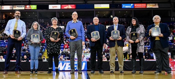 The 2020 inductees, from left, Bruce Lambert, accepting for teammate Charlie Snell; Bob Millard; Stanley Cooper; Charlie Chisholm; Barry Boyer; Jodie Michewicz; Rachel Hoffman; and Jill Henne.